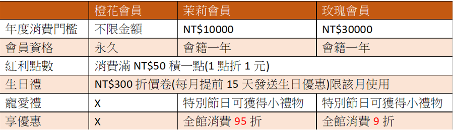 2.若成為茉莉會員,年度消費滿$5000元即可續等;若成為玫瑰會員,年度消費滿$15000元即可續等。